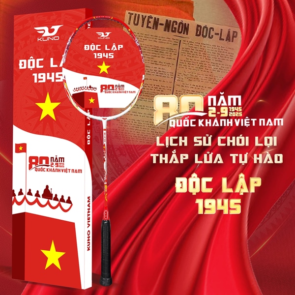 鮮やかな赤・白・金のデザインが印象的な「ĐỘC LẬP 1945」は、パワーと操作性のバランスを兼ね備えた競技者向けラケットです。高弾性カーボングラファイト T700 を採用し、軽量ながら優れた強度と反発力を実現。中級から上級プレーヤーまで幅広く対応します。